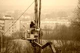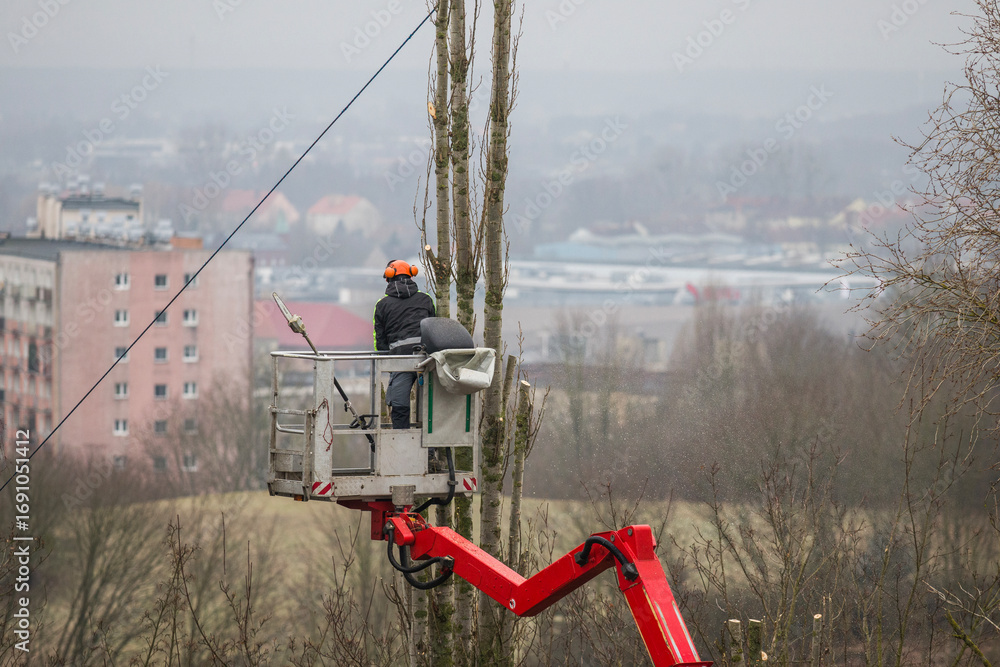 Pruning tree branches on a hoist with a petrol chainsaw.