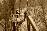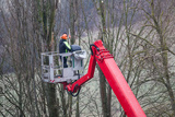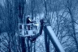 Pruning tree branches on a hoist with a petrol chainsaw.