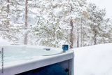 Contrasts of heat and frost — a steaming outdoor jacuzzi with a ceramic mug invites warmth and relaxation amid a serene snow-covered forest. Winter indulgence meets Nordic nature.