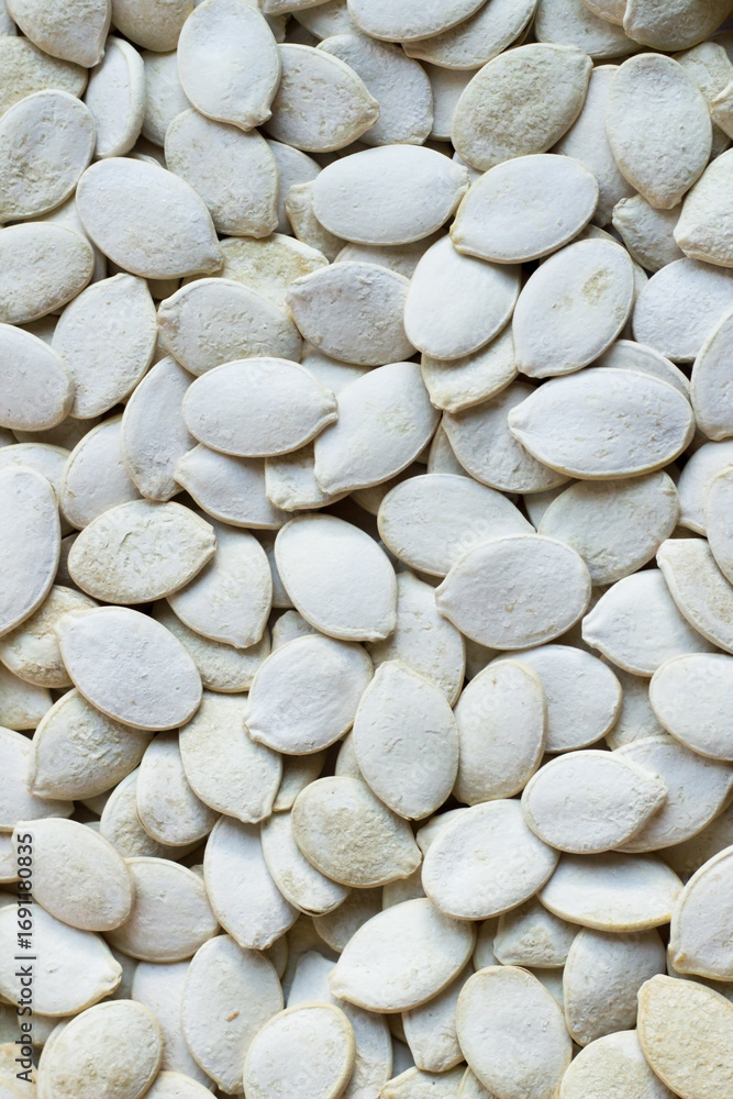 Roasted white pumpkin seeds background. This image can be used horizontally or vertically.