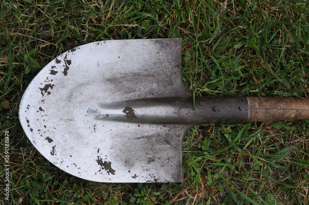 Metal shovel with earth lies on green grass. Close-up of shovel. Tool for manual labor.