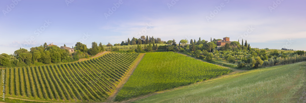 Toskana-Panorama, bei Montespertoli im Chianti-Gebiet ein schöner Gutshof imAbendlicht