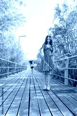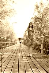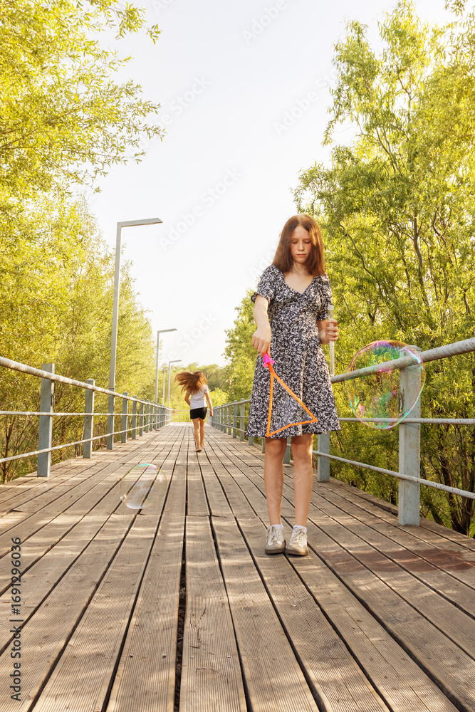 Two young girls having fun outdoors on a sunny summer day, blowing and chasing soap bubbles on a wooden bridge in a park, enjoying carefree childhood moments.