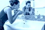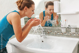 Young Caucasian woman washing her face with fresh water in a modern bathroom sink, performing her daily morning beauty and hygiene routine for clean and healthy skin.