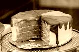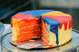 Multicoloured iced sponge cake on sale at a market stall.