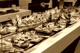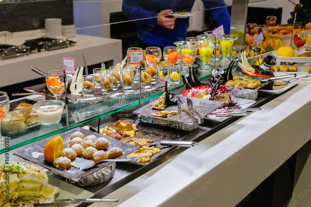 Dessets consisting of cakes, mousses and fruit at the buffet of a hotel restaurant