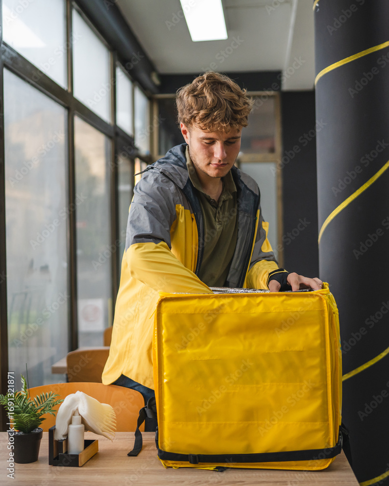 Delivery man picking up food order in restaurant wearing thermal backpack