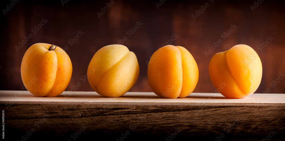 Apricots group in studio lined up on top rustic wooden box and dark background