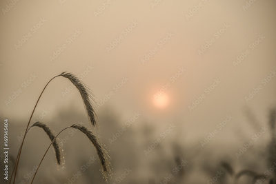 Blades of wheat in a foggy summer morning