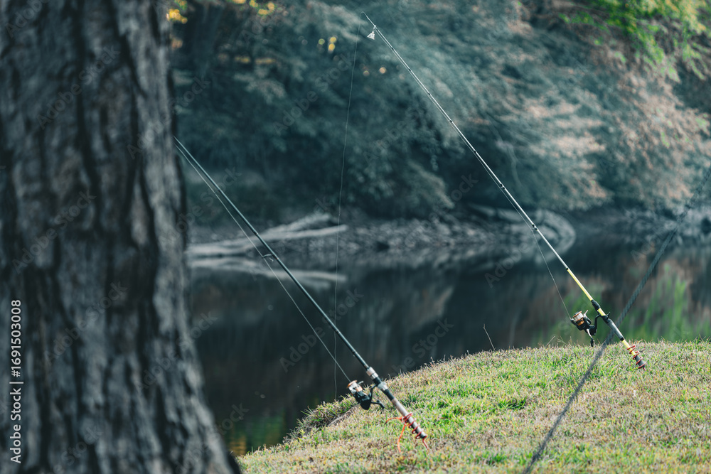 Fishing Rods Set Up by Sutton Lake Shore in West Virginia