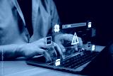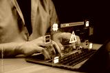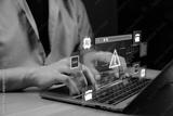 Cybersecurity concept with AI system warning alert on laptop screen, showing data error and digital threat risk, technology background for online security, hacking, and system protection.
