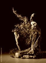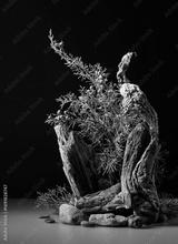 Nature scene with a composition of juniper and dry snags.