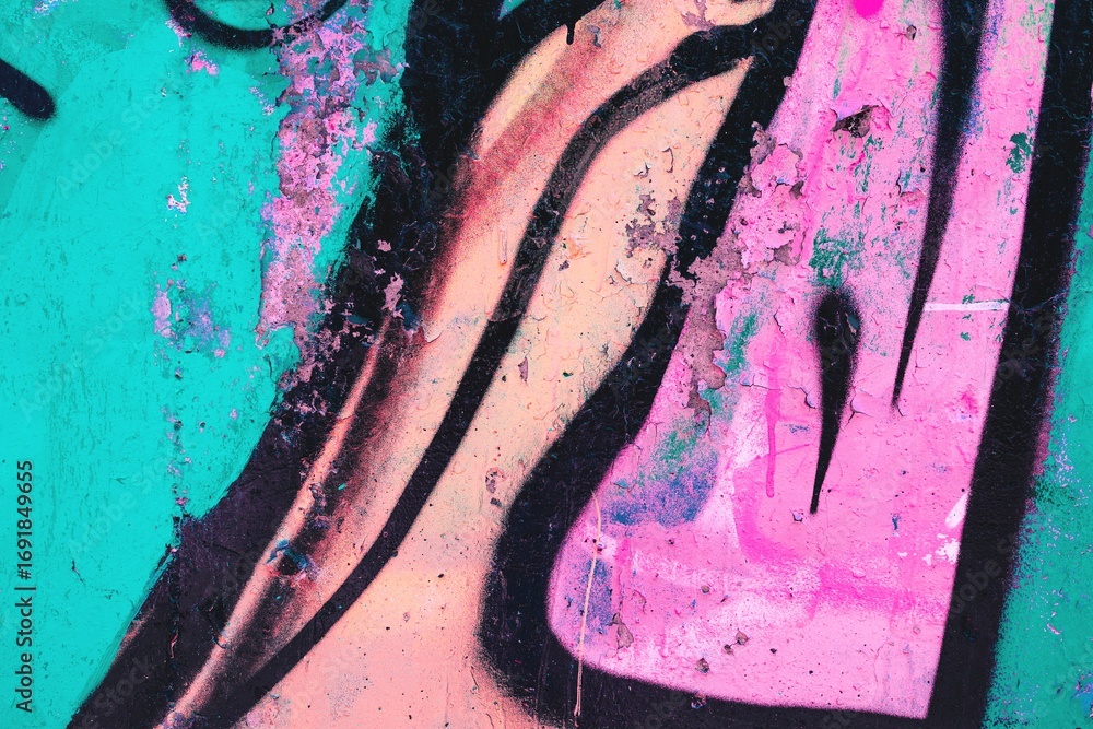 Street graffiti with bold neon pink, aqua, black in 80s urban style, showcasing expressive textures, rough layers. Street art, posters, digital backgrounds, urban designs, modern 90s visuals.