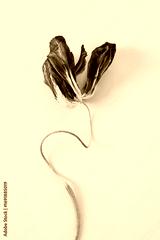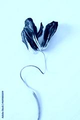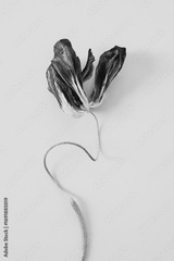 Artistic black and white tulip flower with flowing curved stem against neutral backdrop