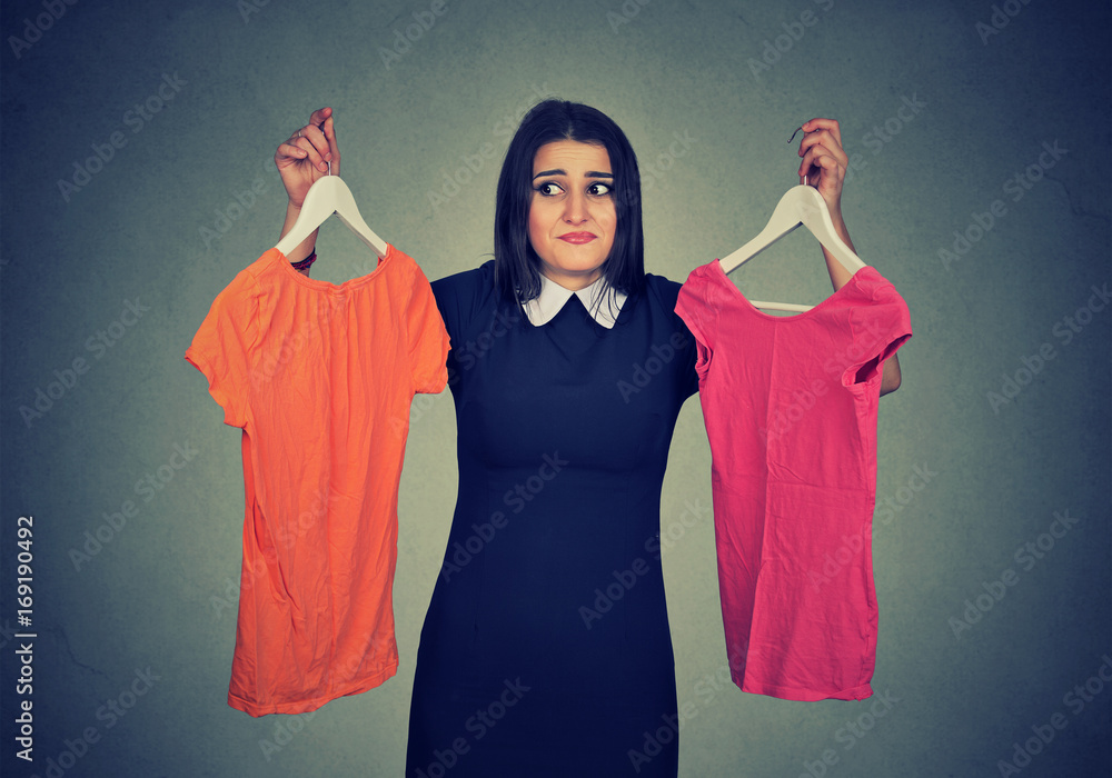 Confused woman choosing between dresses and can not make decision.
