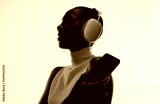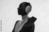 Silhouette of woman with headphones holding smartphone for mockups and music streaming