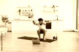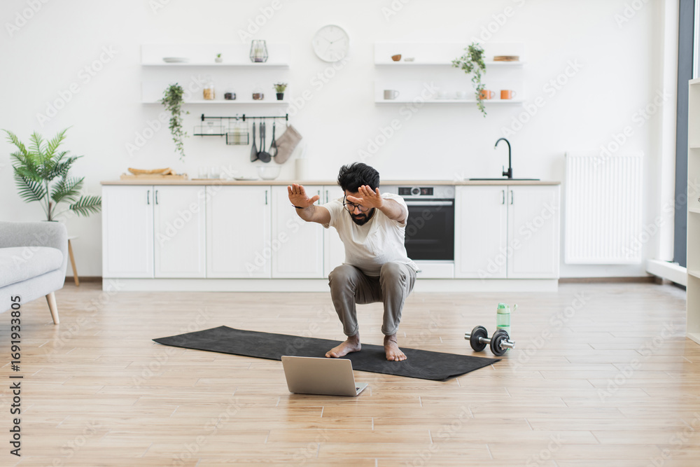 Young adult male exercising indoors on yoga mat following online workout class for fitness