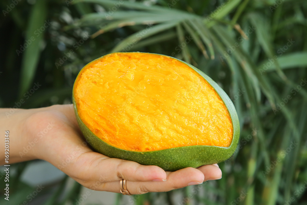 Hand holding fresh ripe mango slice with tropical palm leaves background