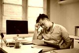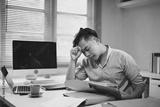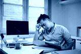Stressed office worker sitting at desk with paperwork, holding his head while reviewing documents