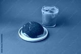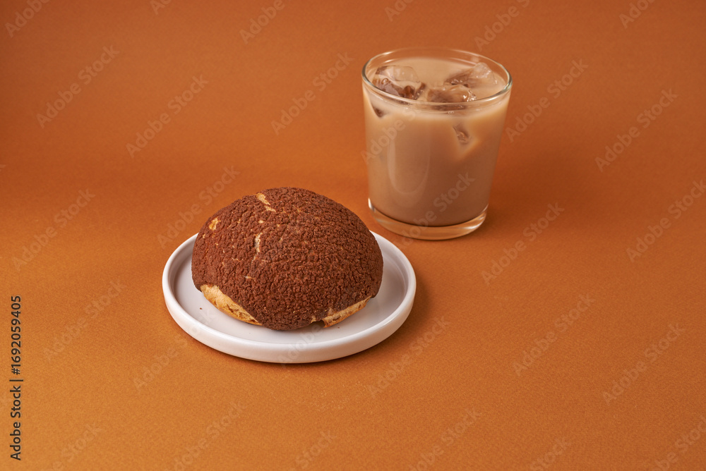 choux cream on a plate and coffee glass over beige background. Japanese Shu Cream
