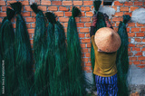 Vietnamese woman in straw hat dries dyed green reeds at a woven mat factory in village in Vietnam