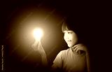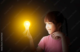 Happy smiling little child asian student girl having fun and looking at education thinking with lightbulb brainstorming creative idea. Back to school concept.