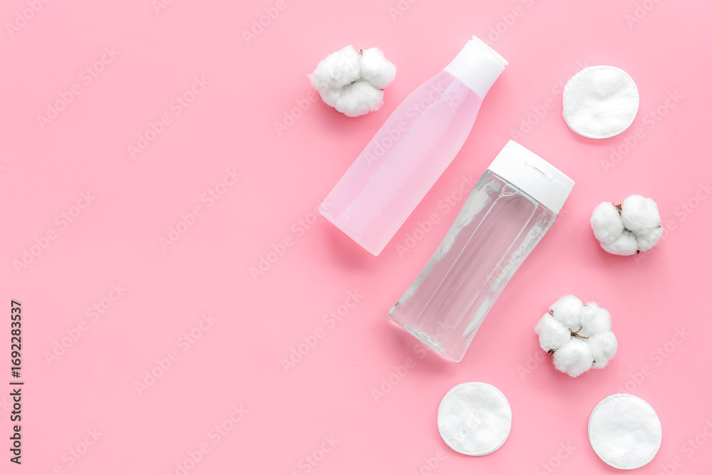 Organic cosmetics for face clearing with cotton pads, facial tonic and mycelial water pink background top view mockup
