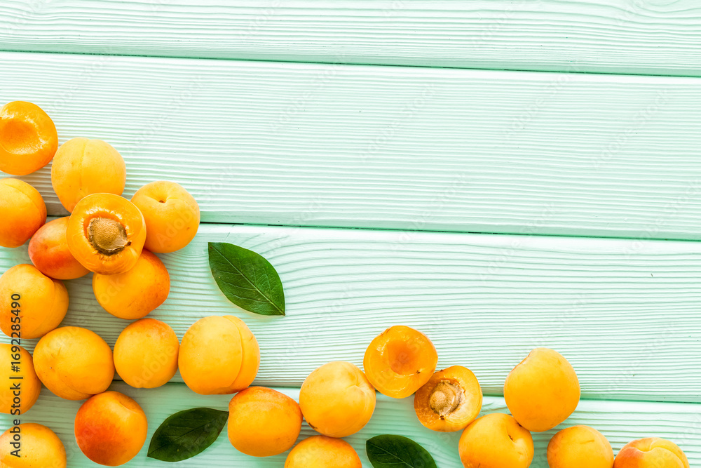 Fruit frame. Apricots and leaves on green wooden background top view space for text