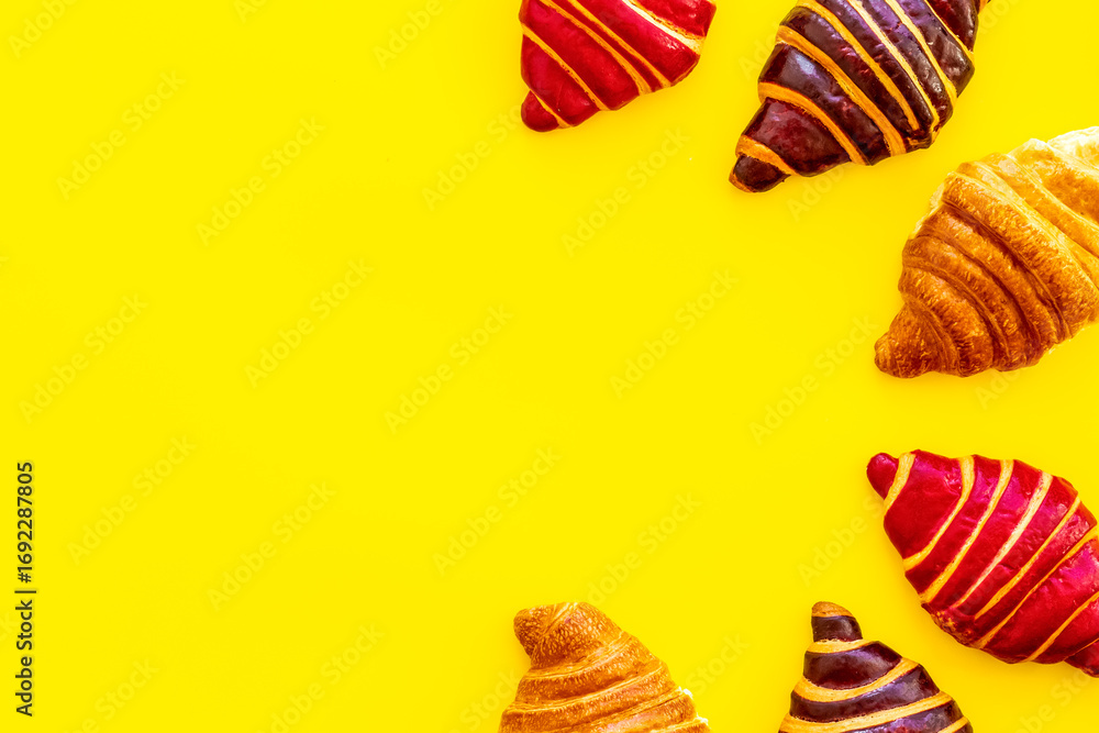 Set of croissants - chocolate, berry, classic - on yellow background top view