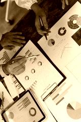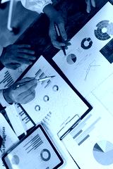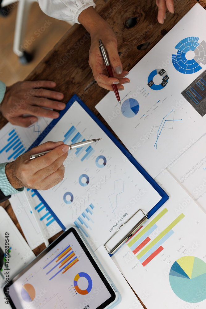 Business colleagues collaborating on a project, analyzing financial charts and graphs on paper and a tablet, using pens to highlight key data during a meeting