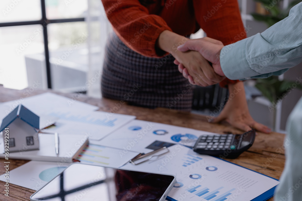 Two business partners shaking hands after signing contract for new house purchase, small house model, calculator, documents, tablet and financial chart on wooden table