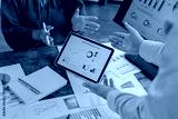 Marketing team analyzing sales performance chart on tablet during a meeting, discussing company strategy and evaluating marketing effectiveness using data visualization tools