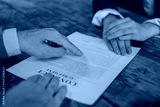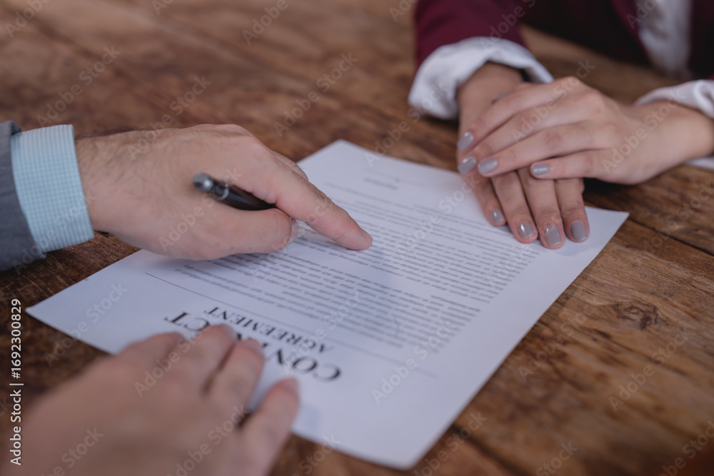 Businessman showing contract details using pen while discussing terms and conditions with female colleague in office meeting, focusing on legal aspects and collaboration