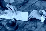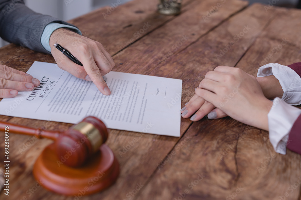 Lawyer showing contract details to client using pen and finger while sitting at wooden table with gavel in courtroom or office during legal consultation