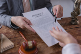 Lawyer showing contract agreement to client and pointing with pen where to sign, with wooden gavel and statue of Lady Justice in the background