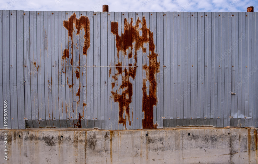 The fence is made of iron sheets with rust.