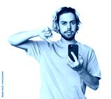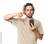 Young Caucasian man with smartphone showing a dislike gesture, thumbs down. Disagreement concept.