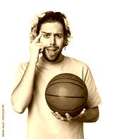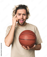Casual young basketball player in studio showing a disappointment gesture with forefinger.