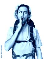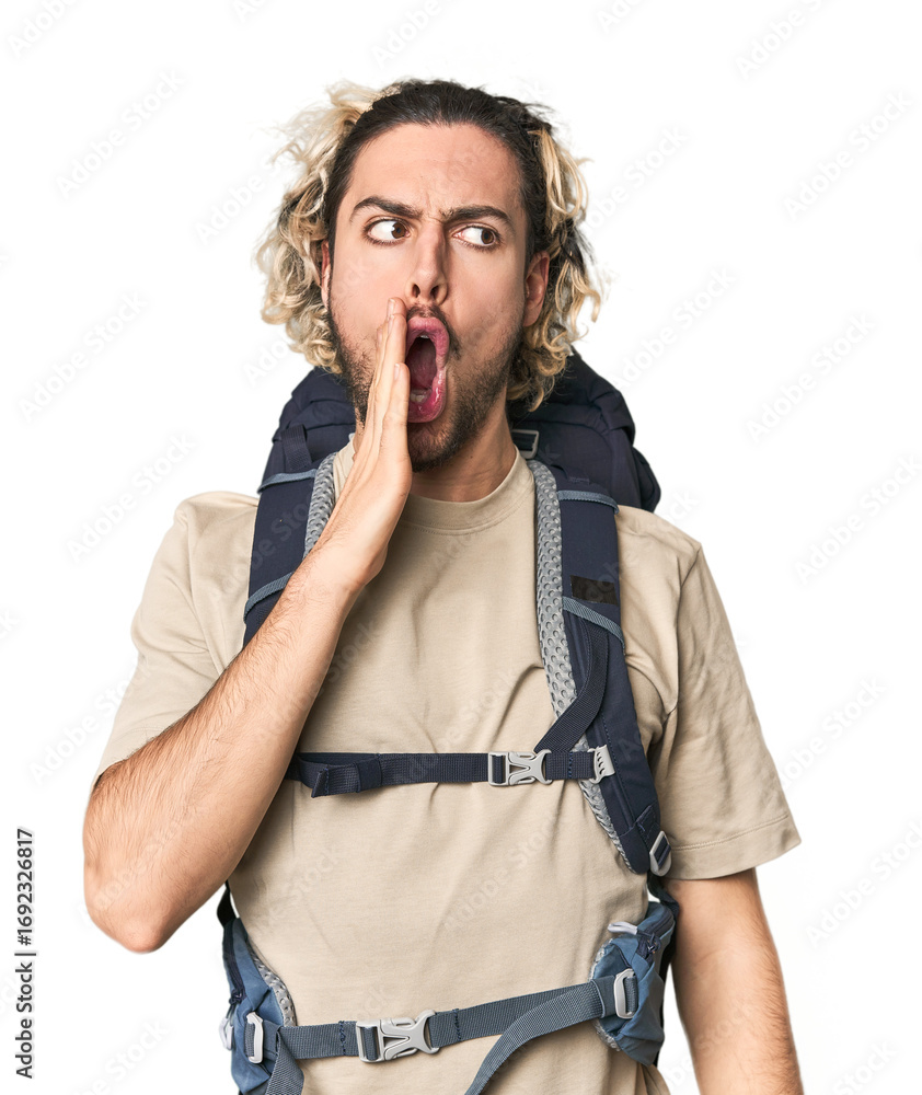 Young Caucasian hiker with backpack is saying a secret hot braking news and looking aside