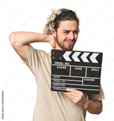 Young man with clapperboard in studio touching back of head, thinking and making a choice.