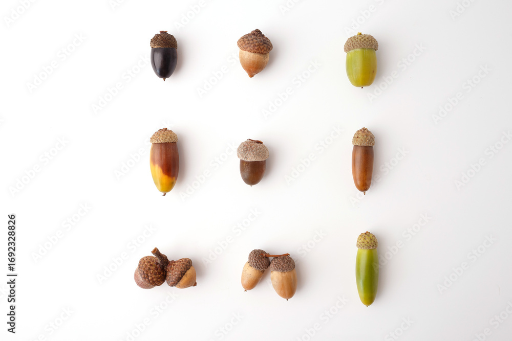 Minimalistic acorn collection on white background, perfect for eco product packaging, sustainable branding, organic food labels, environmental campaigns, nature-focused design.