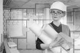 Architecture, construction, engineering. Female architect in hard hat and safety vest holds blueprints while analyzing building plan in unfinished construction site.