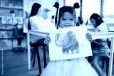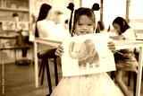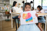 A girl with down syndrome proudly displays her colorful elephant drawing in a classroom setting, while others are working in the background