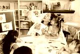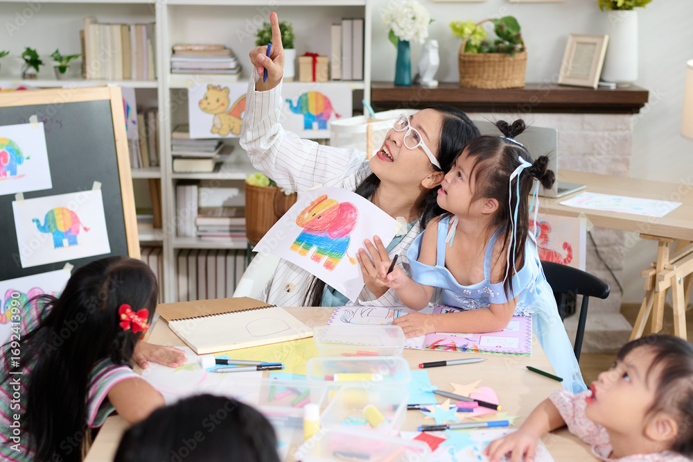 A teacher points upward while drawing on a paper with children. They are engaged in an art lesson together, smiling and having fun