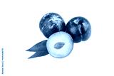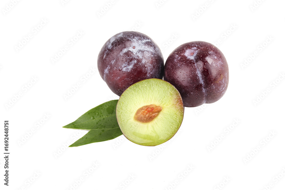 Fresh Sweet Plums with Green Leaves Cut in Half Showing Pit Isolated on White Background