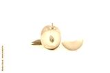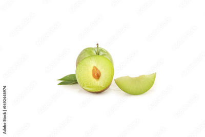 Fresh Green Plum Cut in Half with Slice and Leaves on White Background