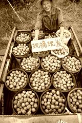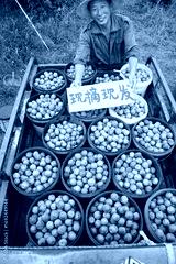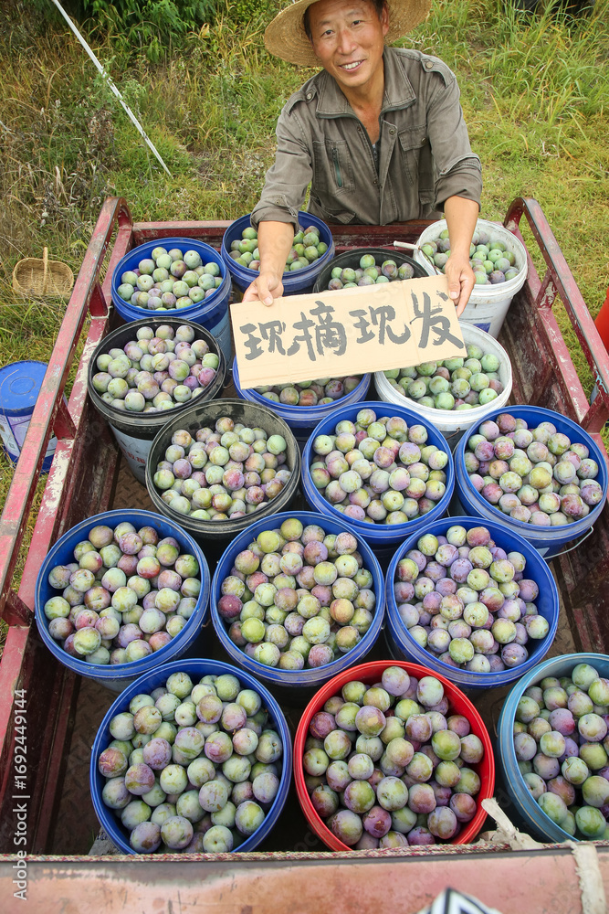 Asian Farmer With Fresh Plum Harvest Display At Local Market