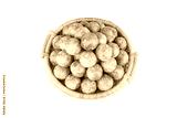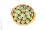 Fresh Green and Red Plums in Wicker Basket on White Background