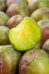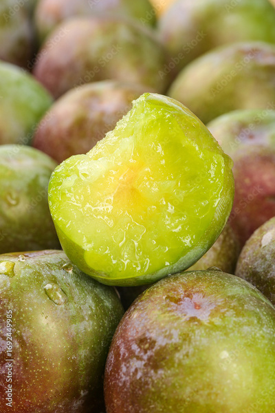 Fresh Green Plums Cut in Half Showing Juicy Interior - Healthy Summer Fruit