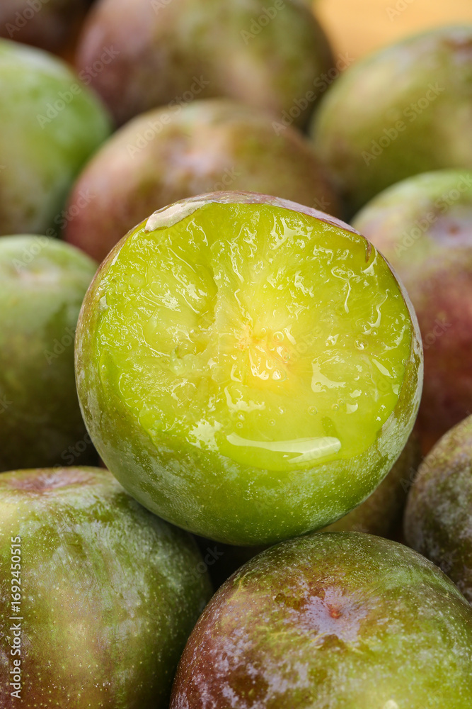 Fresh Green Plums with Cut Half Showing Juicy Interior - Healthy Fruit Photography